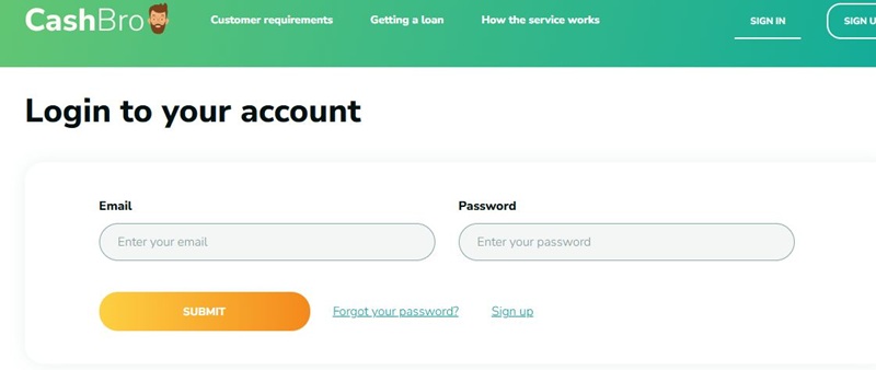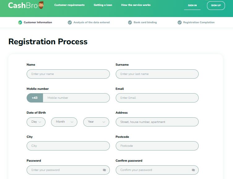 CashBro jest pośrednikiem kredytowym i pomaga dopasować wymaganą pożyczkę do klienta. Rejestracja w serwisie składa się z kilku kroków: