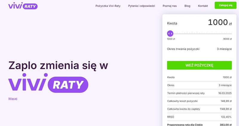 RRSO od 0% do 311.8% od 300 do 4 000 zł od 18 lat od 10 do 30 dni Ostatnia aktualizacja: 29 grudzień 2025 Szukaj mikropożyczek według kwoty i terminuVivi-Raty - opinie klientówWziąłem pożyczkę w Vivi-Raty wszystko poszło sprawnie, ale oprocentowanie mogłoby być trochę niższe. Na szczęście spłaciłem na czas i nie było problemów.