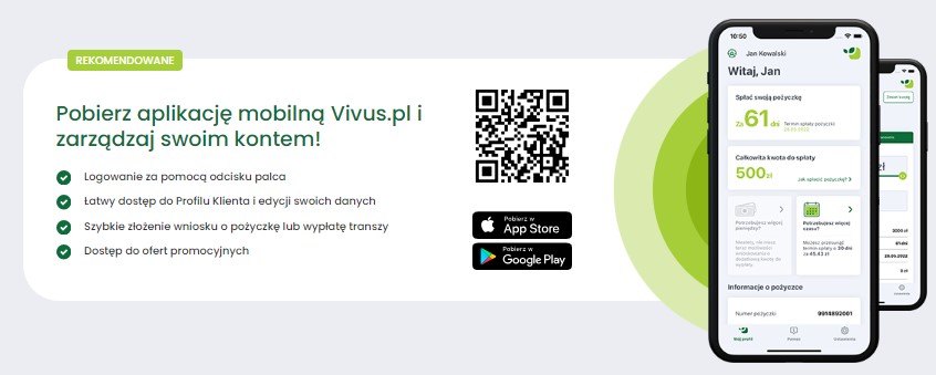 A co jeśli używasz aplikacji mobilnej Vivigo?W takim przypadku dostępne jest logowanie za pomocą odcisku palca. Oczywiście logowanie z użyciem odcisku palca to jedynie dostępna opcja. Logowanie z aplikacji mobilnej to jednocześnie łatwy dostęp do profilu klienta i edycji swoich danych czy ofert promocyjnych, szybkie złożenie wniosku o pożyczkę lub wypłatę transzy. Po wpisaniu poprawnych danych na stronie Vivus logowanie zostaniesz przeniesiony do swojego profilu klienta Vivigo (konto Vivigo).
